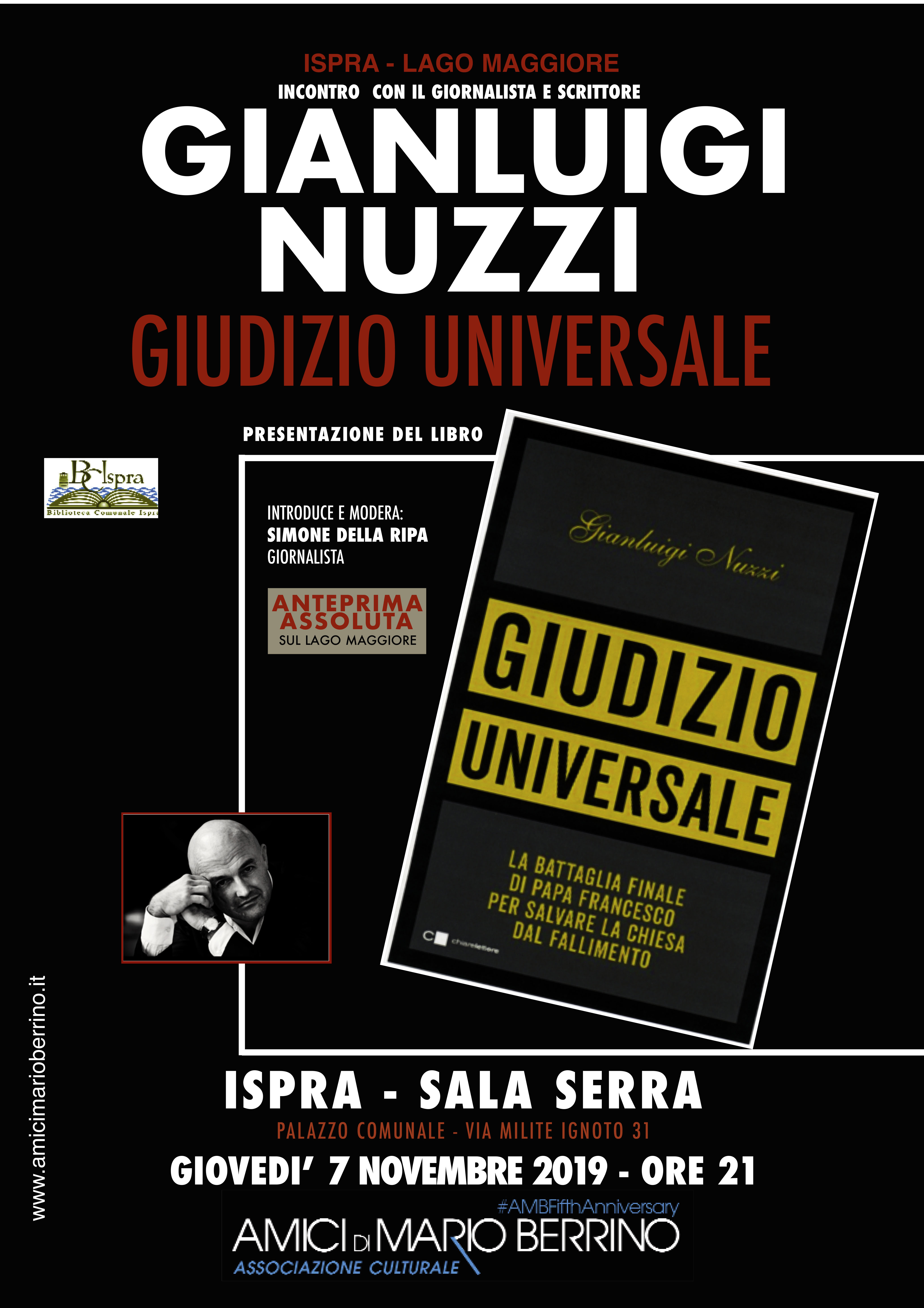 Giovedì 7 novembre 2019 alle ore 21.00 presso la Sala Serra si terrà un incontro con il giornalista e scrittore Gianluigi Nuzzi che presenterà il libro “Giudizio Uninversale” – La battaglia finale di Papa Francesco per salvare la Chiesa dal fallimento. L’evento è promosso dall’Associazione Amici di Mario Berrino.