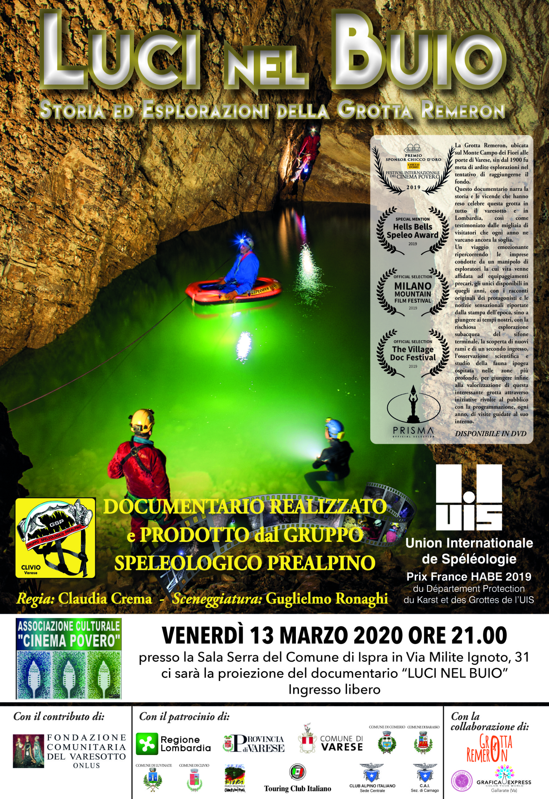 Venerdì 13 marzo 2020 alle ore 21,00 presso la Sala Serra ci sarà la proiezione del documentario “Luci nel buio” storia ed esplorazioni della grotta Remeron. L’evento è promosso dall’Associazione Culturale Cinema Povero.