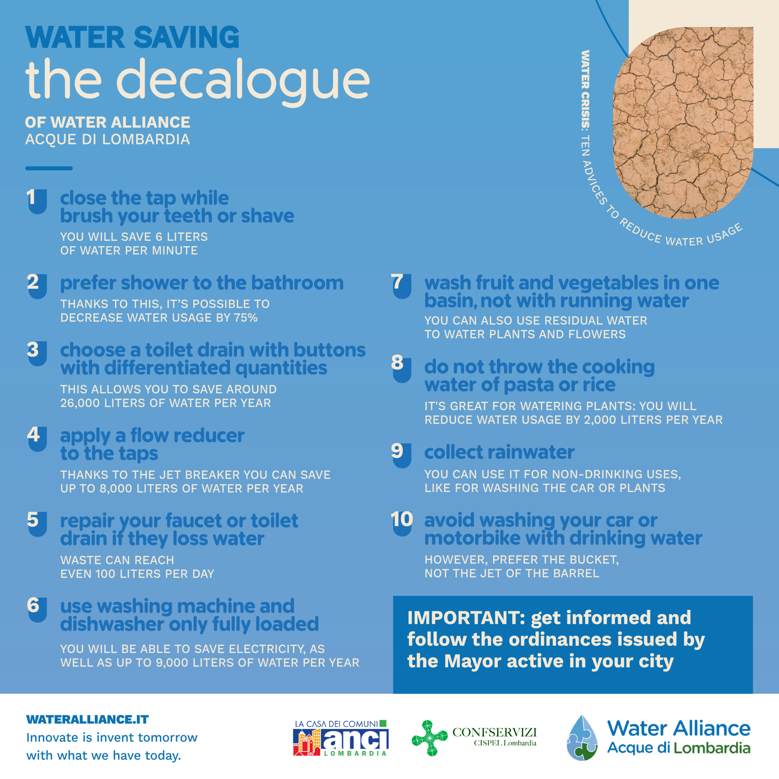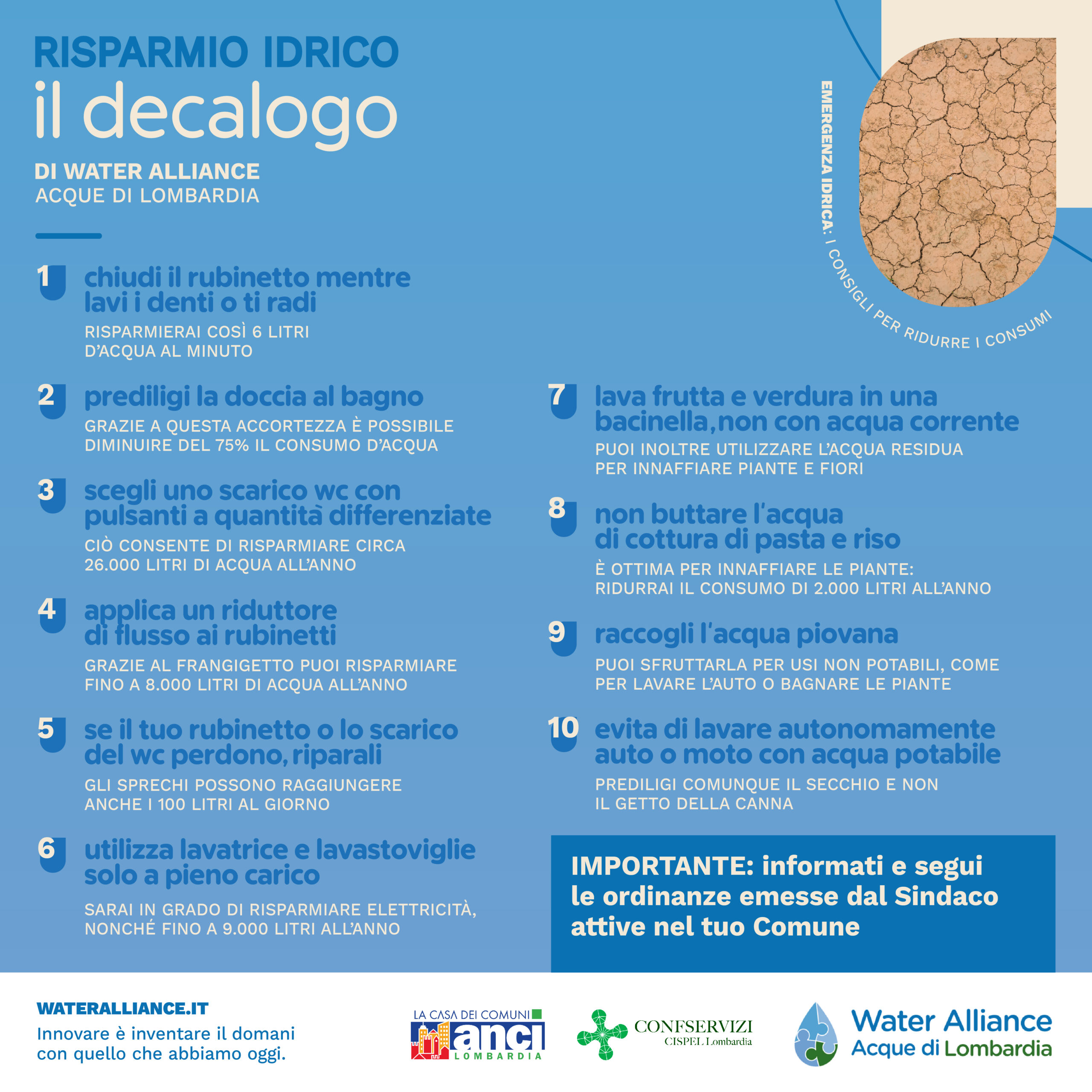 Richiamando l’invito alla popolazione ad un uso razionale dell’acqua, pubblichiamo il Vademecum sul risparmio della risorsa idrica predisposto dalla società Alfa srl, gestore del servizio idrico integrato e un volantino redatto sia in lingua italiana che inglese da Anci Lombardia.