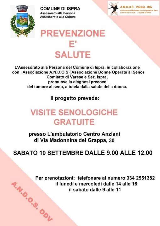Il progetto prevede Visite Senologiche gratuite presso l’ambulatorio del centro anziani di Ispra di via Madonnina del Grappa 30,