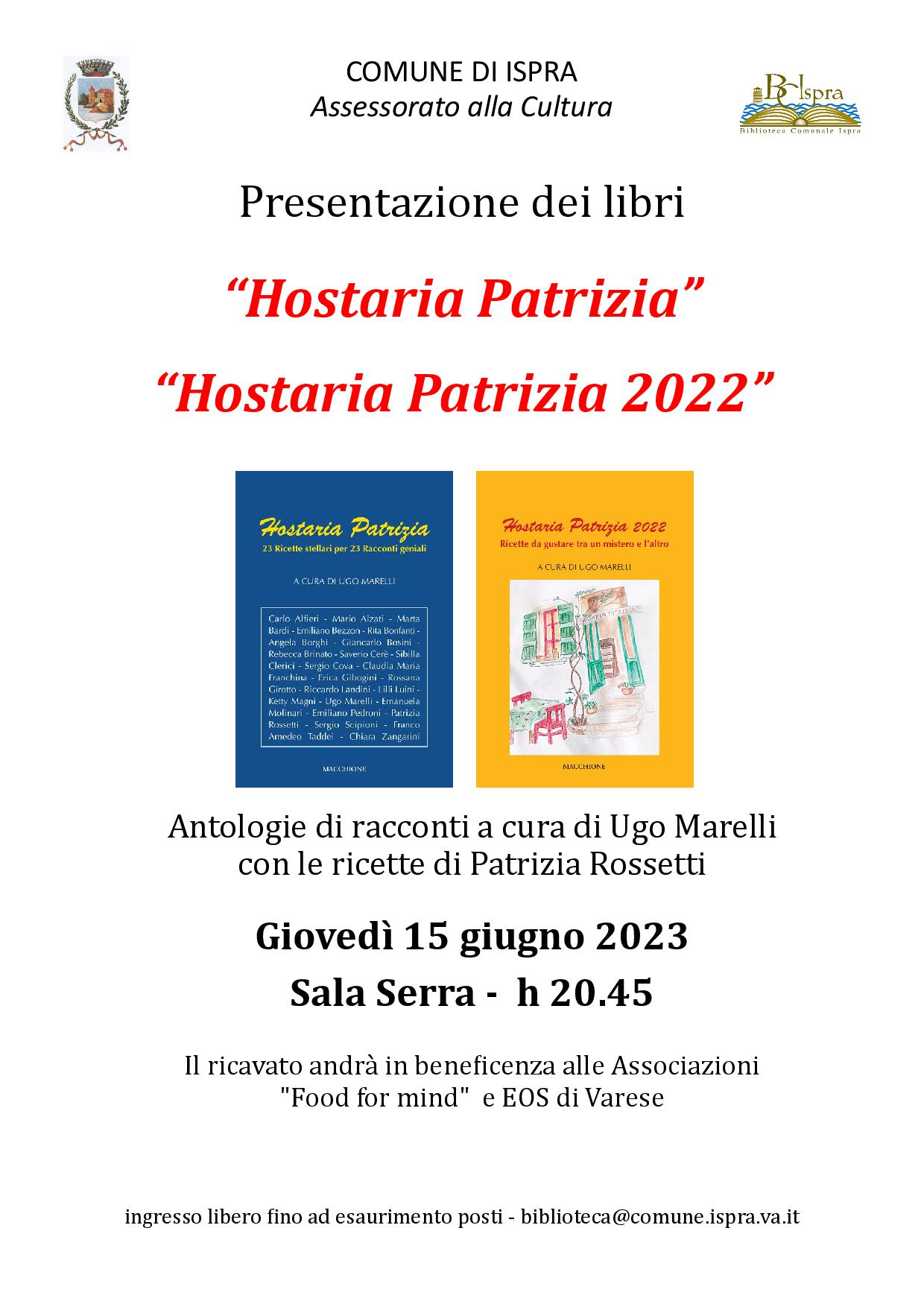 Presenteremo due antologie dal titolo “Hostaria Patrizia” e “Hostaria Patrizia 2022” curate da Ugo Marelli e corredate dalle ricette di Patrizia Rossetti.