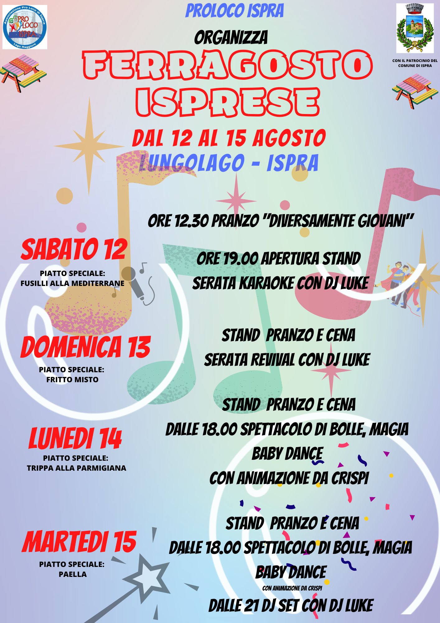 Da Sabato 12 agosto a Martedì 15 agosto 2023 si terrà in Piazzale Rapazzini il tradizionale Ferragosto Isprese organizzato dalla Pro Loco Ispra.