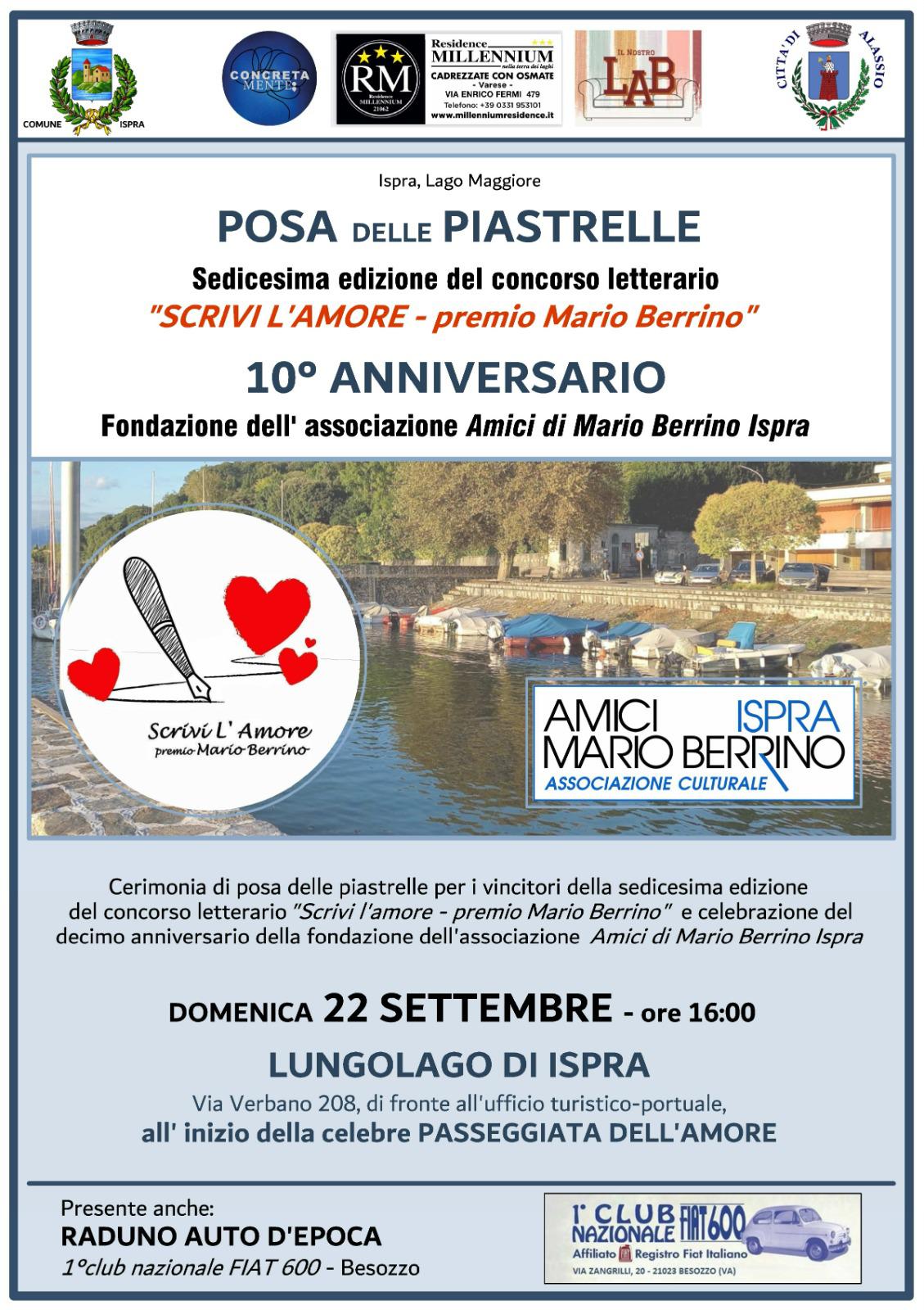 Domenica 22 settembre 2024 alle ore 16,00 in località lungolago di Ispra, si terrà la cerimonia di posa della piastrella per i vincitori della sedicesima edizione del concorso letterario “Scrivi l’amore – premio Mario Berrino”, organizzata dall’Associazione Amici di Mario Berrino e patrocinata dal Comune di Ispra e la celebrazione del decimo anniversario di fondazione dell’Associazione Amici di Mario Berrino.